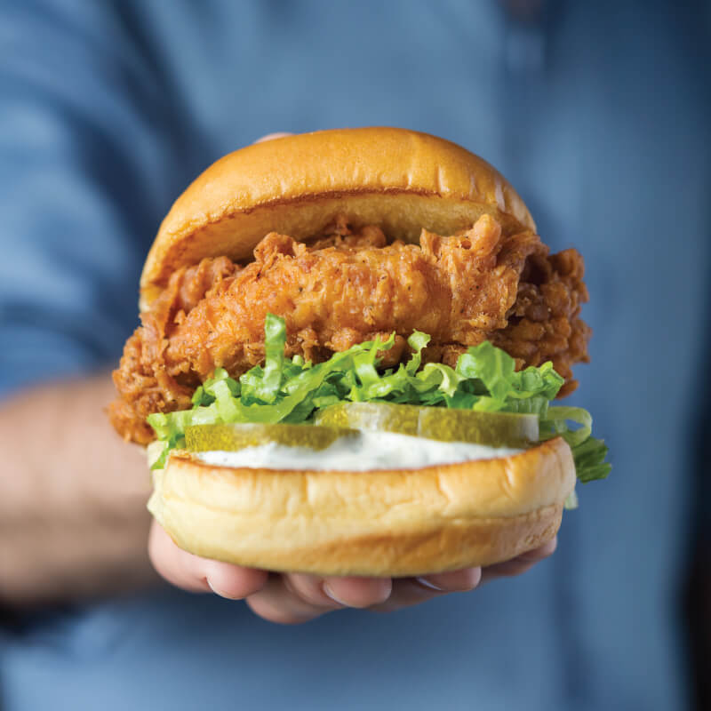 Bird’s the word… The Chicken ShackTM is a crispy 100% all-natural and antibiotic-free chicken breast with lettuce, pickles and buttermilk herb mayo.