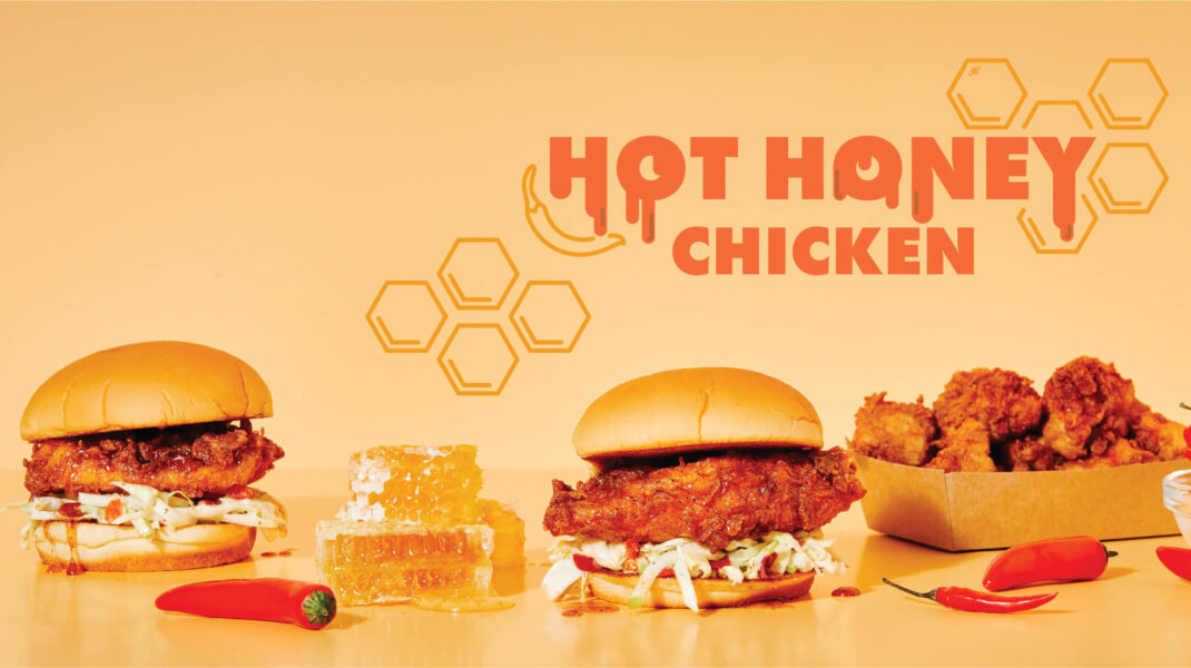 Our new Hot Honey Chicken menu featured 100% chicken breast, glazed with our new sweet & spicy hot honey sauce and dusted with spicy seasoning.