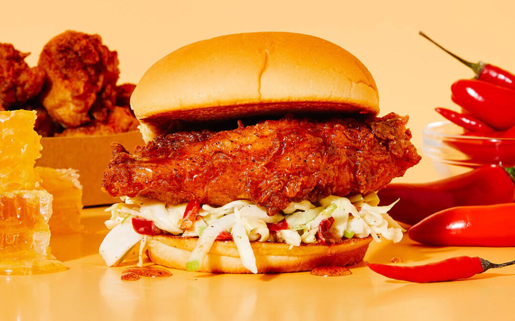 A hot honey-glazed crispy chicken breast topped with our cabbage and apple slaw on a toasted potato bun.