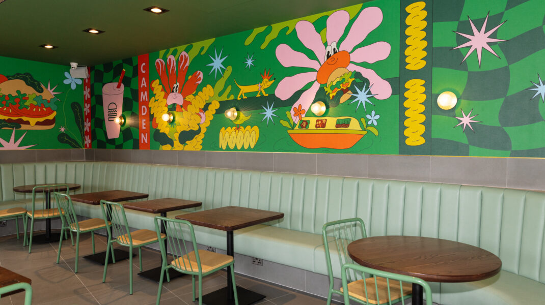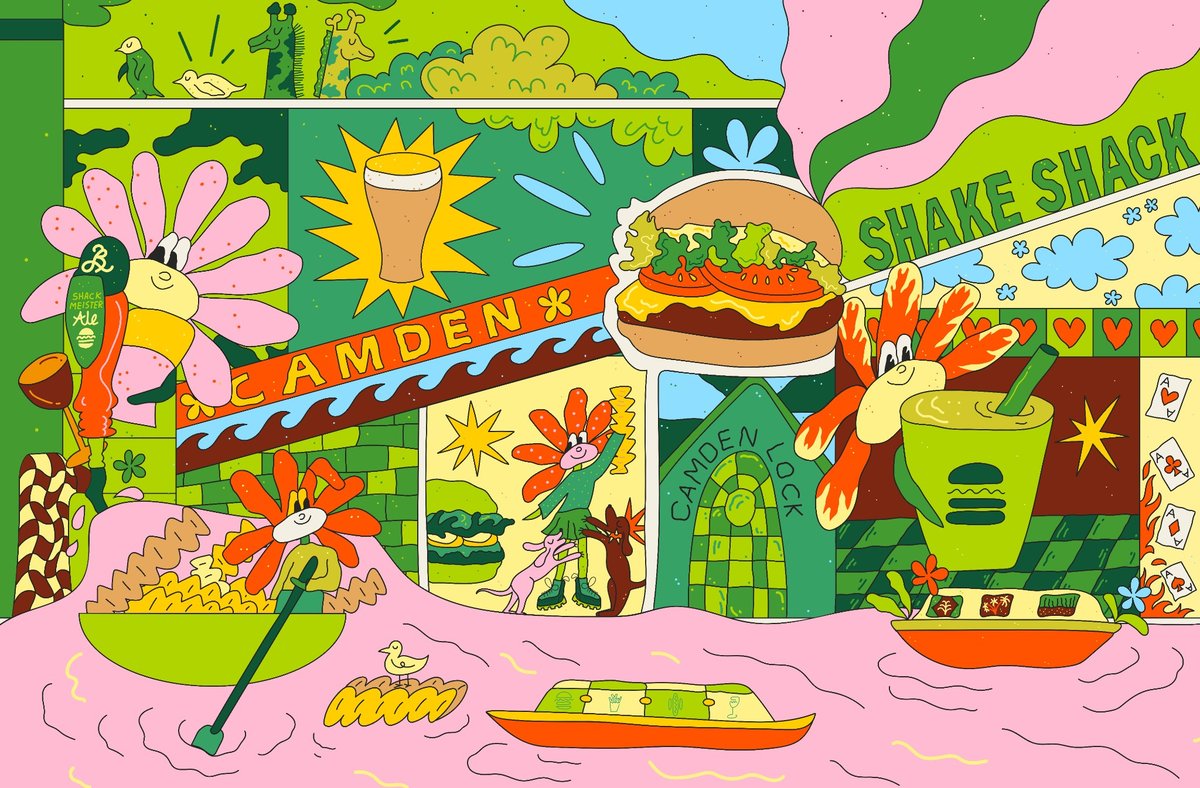 We have collaborated with illustrator, Aga Giecko, to create bespoke artwork for our newest Shack. Inspired by the energy and culture of Camden, Aga blends our menu items with her take on the iconic sites of Camden. She uses vibrant colours and motifs that reflect the bright and eclectic painted shops and buildings on the High Street. You will find fun, floral characters bringing the scene to life in and around the Shack.
