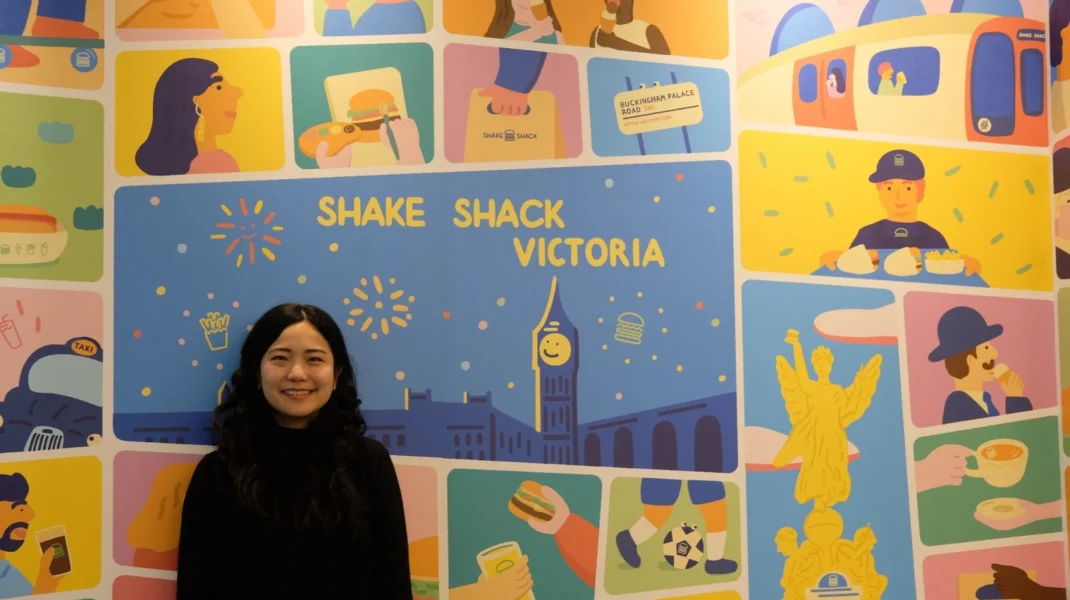 Since I get most of my inspiration from visiting places, I went to Victoria and walked around the area to understand the area and community. Then, I created three concept sketches. The first concept had a map-like style, the second was a lively composition where I illustrated different elements at varying scales, and the third was a comic panel-like style, which we ultimately decided to go with. I wanted to create a joyful and playful piece where everyone, including dogs and London icons like Big Ben, were enjoying having Shake Shack food.